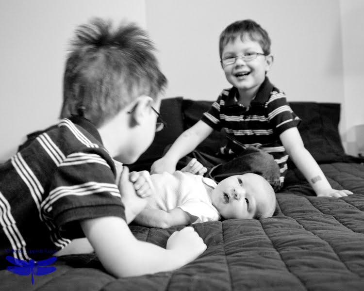 The boys really wanted to include props in their pictures. Here they are giving Anabelle her welcome home from the hospital presents.